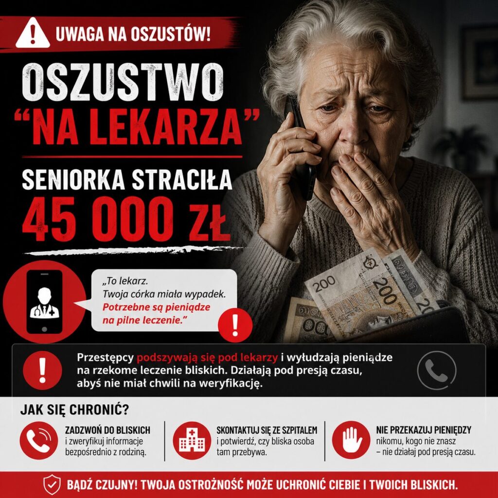 Policja ustala sprawców oszustwa metodą „na lekarza” w wyniku którego 92-letnia mieszkanka powiatu tomaszowskiego straciła 45 000 złotych. Seniorka uwierzyła, że przekazane nieznajomemu pieniądze pomogą w zakupie bardzo drogiego leku i uratują jej ciężko chorego syna. Mundurowi apelują o czujność i rozwagę w kontaktach z nieznajomymi!